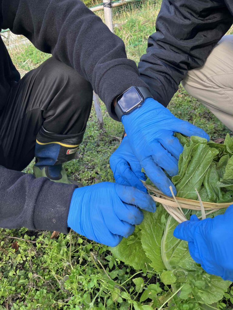 畑に冬の気配が近づくと、この作業が待っています。そう、白菜の藁縛りです。空気がひんやりする中、冬に向けた大事な手入れをしてきました。藁で縛る理由は、厳しい冷え込みや風によって外葉が広がり、雨や雪が入り込んで腐るのを防ぐ為です。外葉をやさしく閉じてあげて、中の葉を寒さと湿気から守ります。