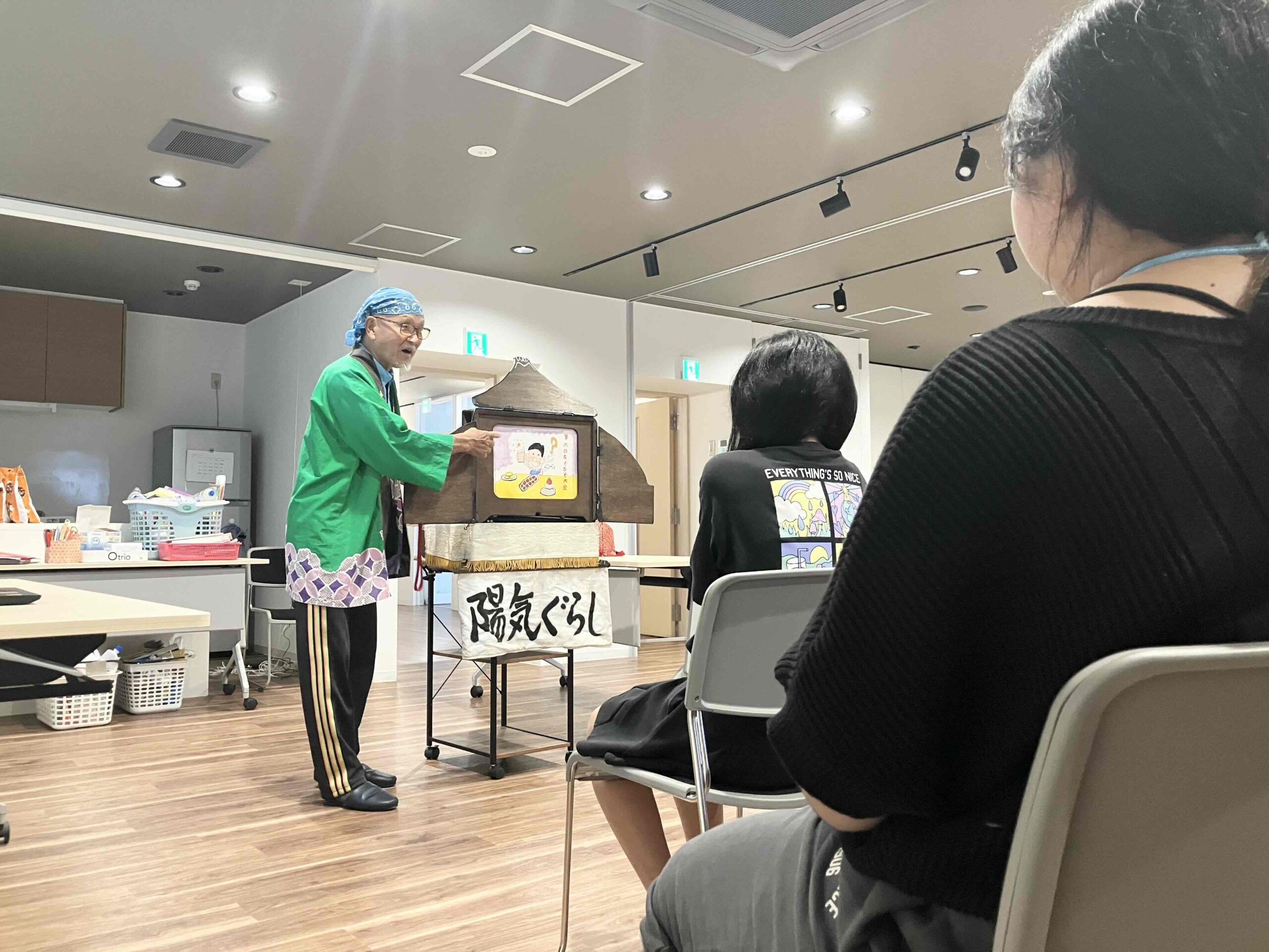 今日はなんと、地域貢献事業みその子どもクラブ(学習支援)に紙芝居師さんが来てくれました!普段は自転車で移動し、公園などで紙芝居をしておられるそうです。全てが手作りで、物語を考えたのも絵を描かれたのもご本人との事でした。